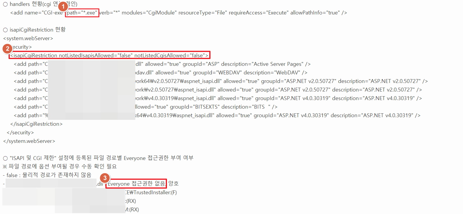 > 결론 : .exe 파일에 대해서 실행되도록 매핑되었으나, isapiCgiRestrion 설정에서 특정 파일들 외에 실행되지 않도록 설정하고 있고, 실행 가능한 파일들에 대해 권한 설정도 잘되어있으므로 양호처리